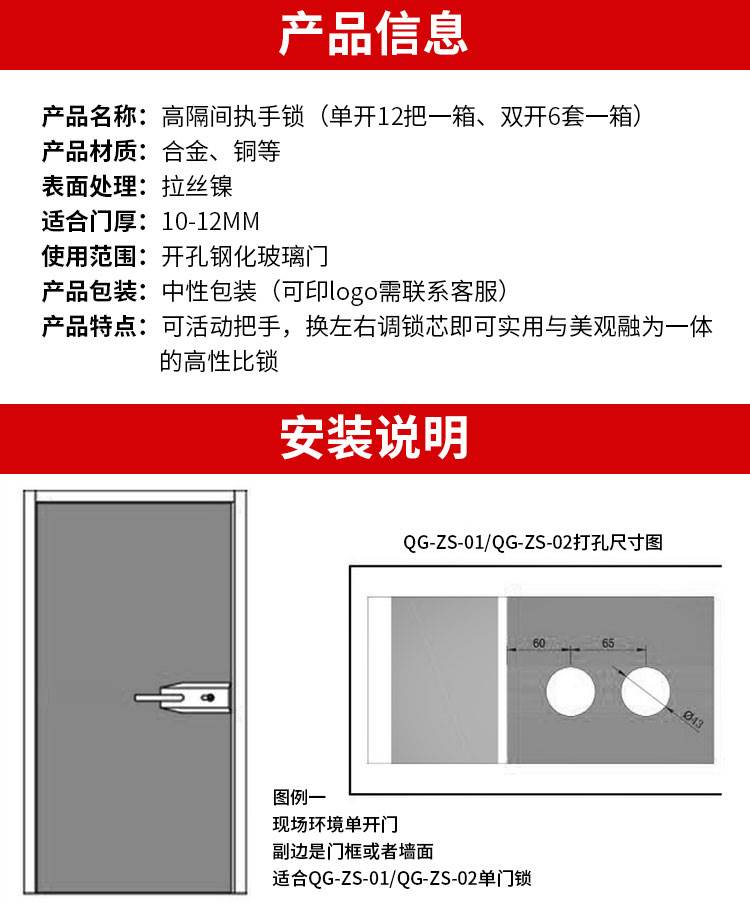 产品详情:高隔间玻璃锁使用优质锌合金制成,美观,结实,防腐蚀,适用于10-15mm的钢化玻璃,可移动的手柄,左右左右更换锁芯既实用又实用美观,实用且具备成本效用的锁。